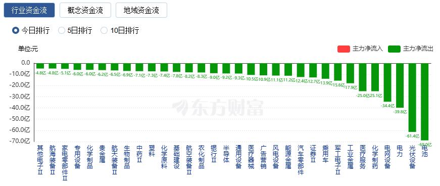 净流出方面,电池、光伏设备、电力等净流出排名靠前,其中电池净流出68.96亿元。