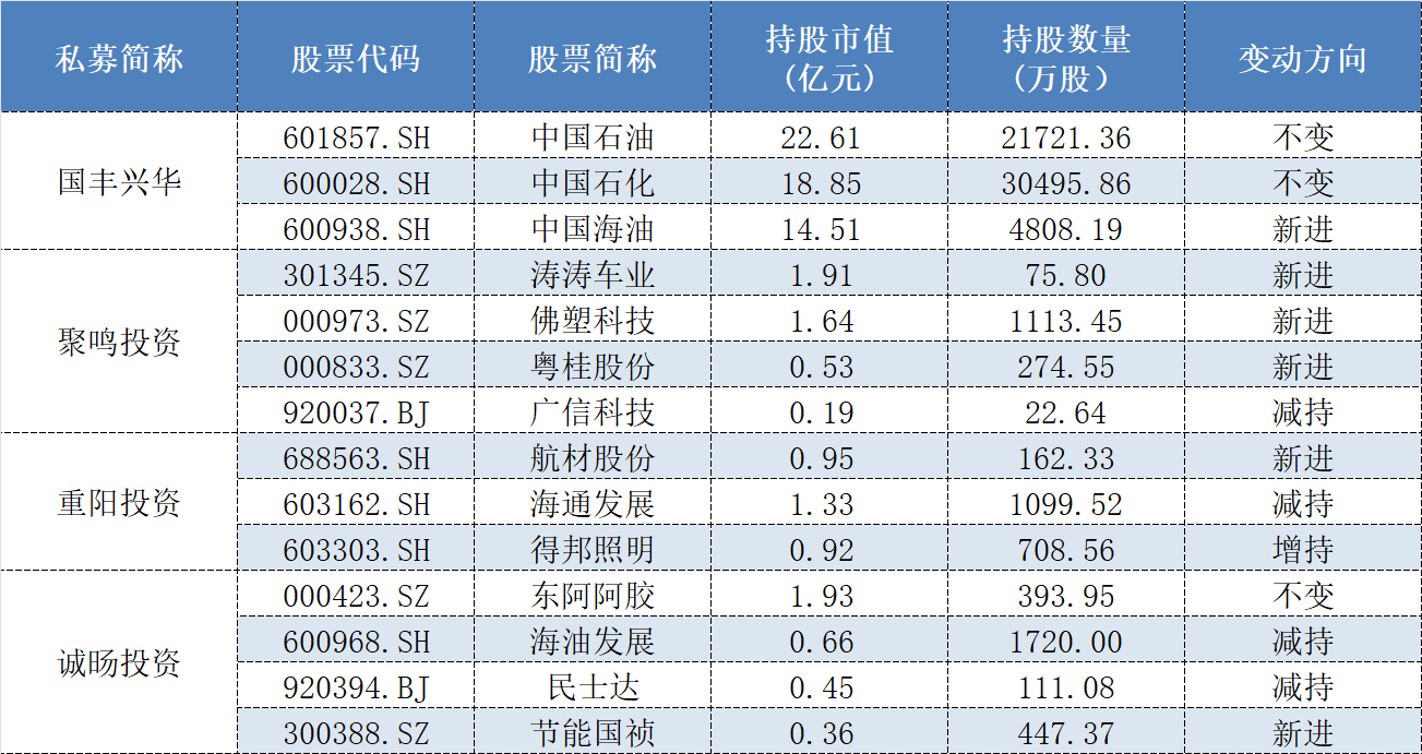 千亿险资系私募国丰兴华对石油股青睐有加,去年四季度不仅继续坚守中国石油(601857.SH)、中国石化(600028.SH),还新进成为中国海油(600938.SH)第七大流通股东,截至2025年年末,持仓上述三只个股的参考市值分别为22.61亿元、18.85亿元和14.51亿元。