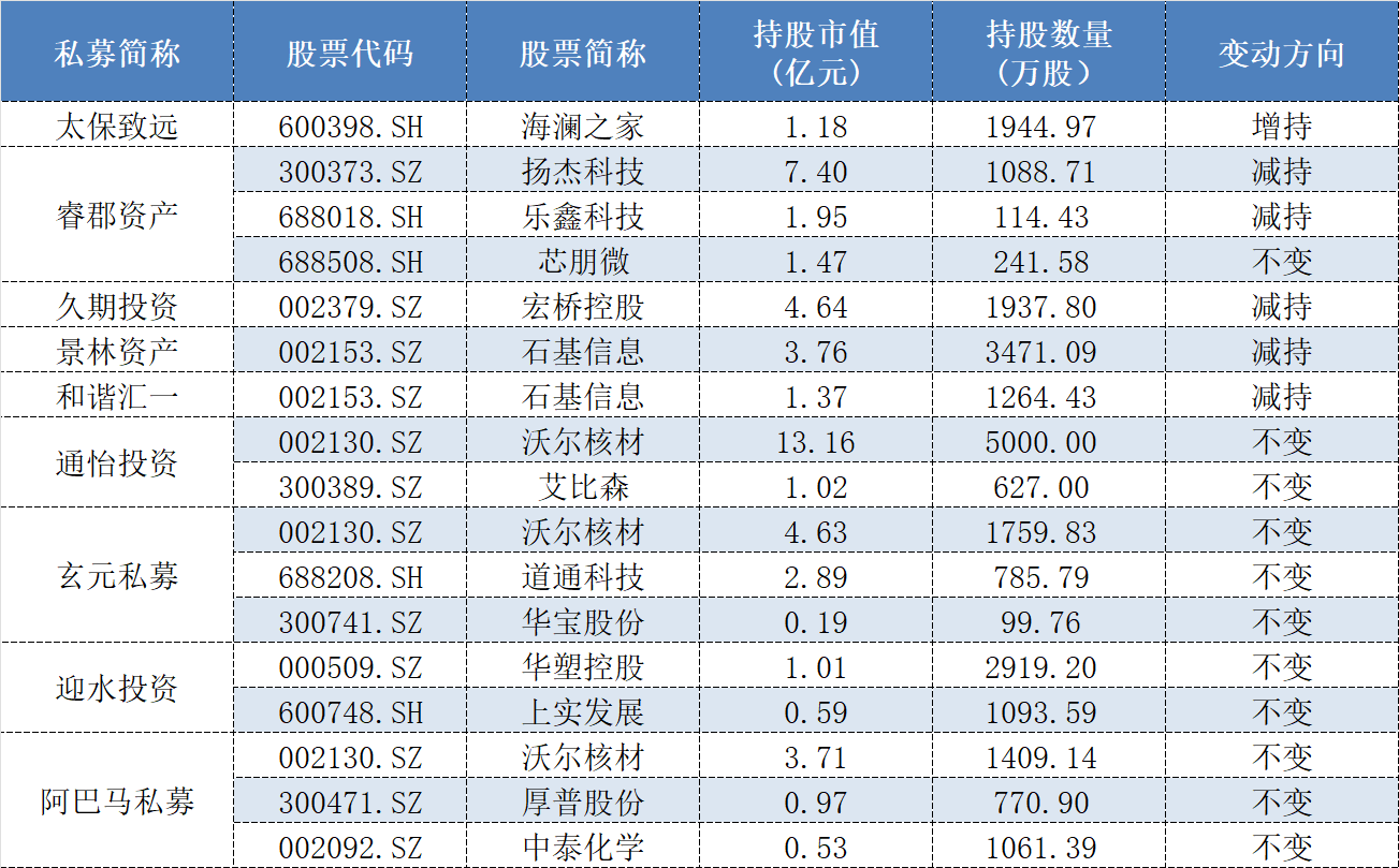 重阳投资去年四季度新进航材股份(688563.SH),期末持仓参考市值为0.95亿元;增持486.53万股得邦照明(603303.SH);减持27.32万股海通发展(603162.SH)。