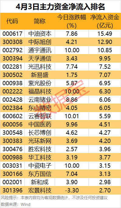 多只光模块产业链个股获主力资金大手笔净流入,包括中际旭创、通宇通讯、天孚通信、光迅科技、新易盛等,金额均超7亿元。