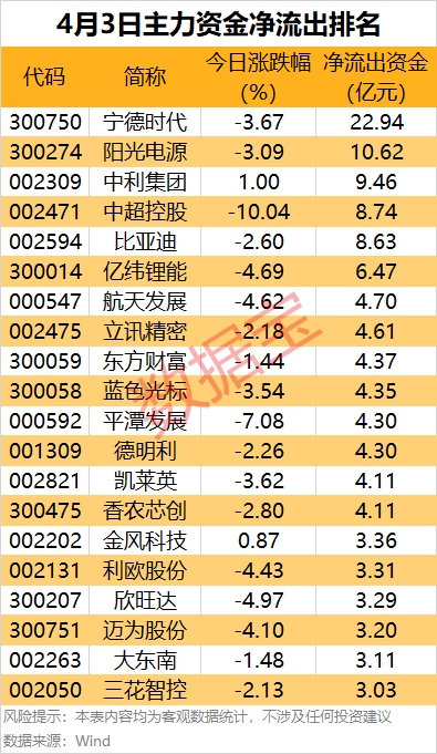 此外,中利集团、中超控股、比亚迪和亿纬锂能主力资金净流出均超6亿元,居前列。