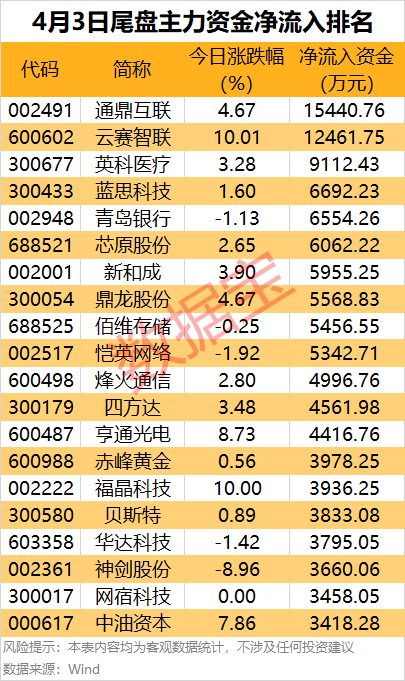 从个股来看,10股尾盘主力资金净流入金额均超5000万元,光纤股通鼎互联和云计算概念股云赛智联尾盘净流入均超1亿元,居前列。