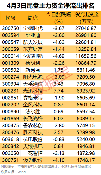 主力资金 | 尾盘6股出逃资金超亿元.
