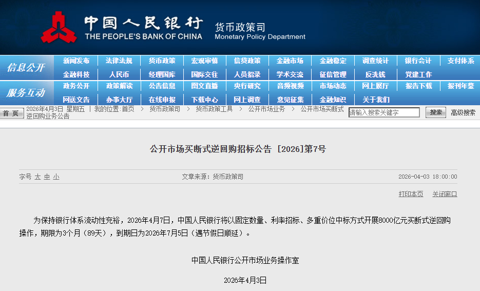 4月3日,中国人民银行发布公开市场买断式逆回购招标公告称,为保持银行体系流动性充裕,2026年4月7日,将以固定数量、利率招标、多重价位中标方式开展8000亿元买断式逆回购操作,期限为3个月(89天),到期日为2026年7月5日(遇节假日顺延)。