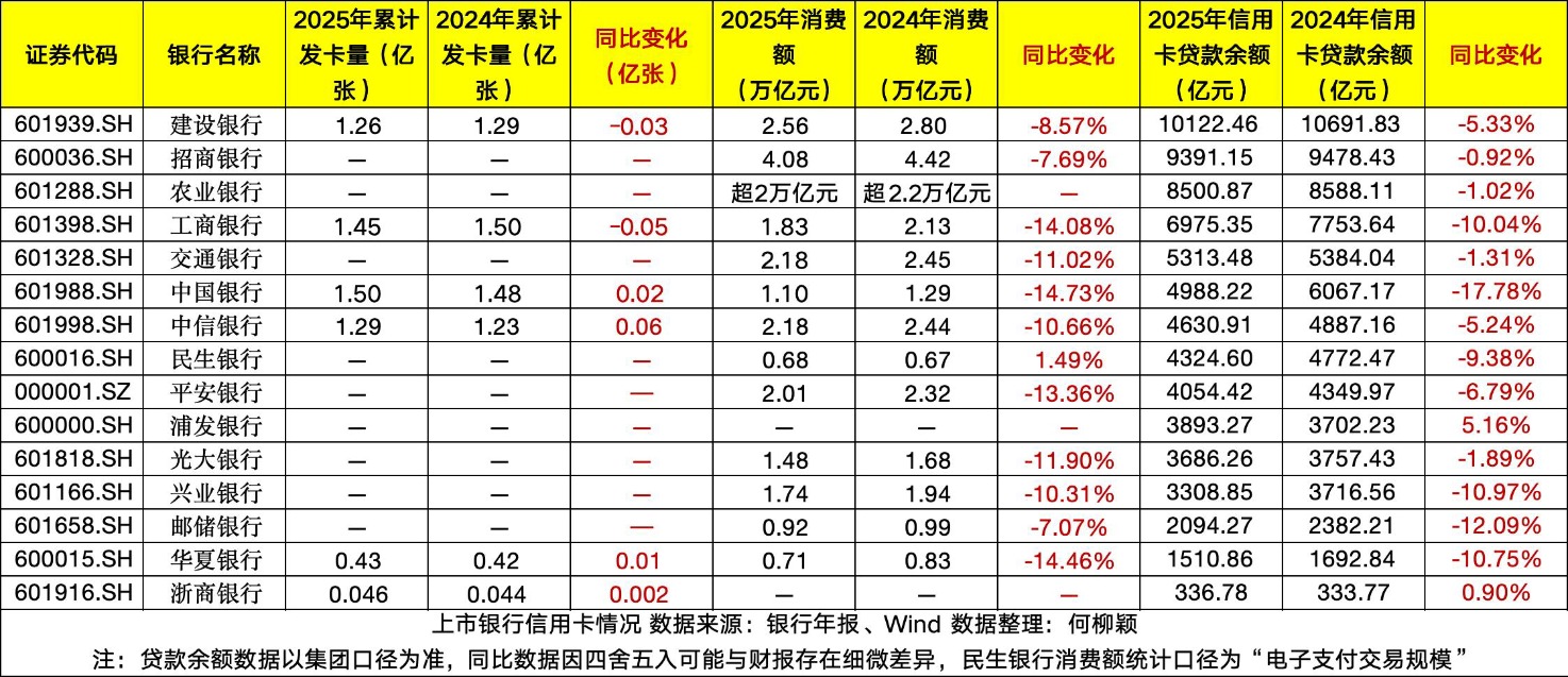 从信用卡贷款余额看,2025年,建设银行(601939.SH)继续守住“龙头地位”,但规模有所收缩。