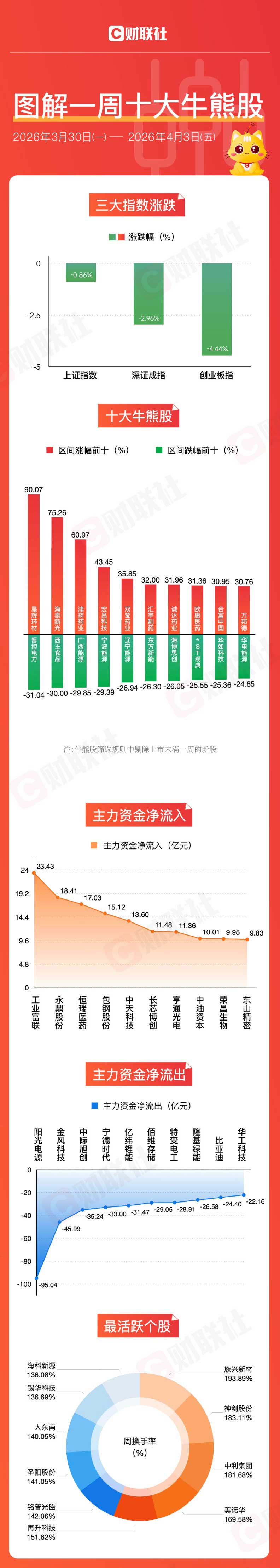 财联社4月4日讯,本周A股三大指数震荡回调,其中上证指数周跌0.86%,深成指周跌2.96%,创业板指周跌4.44%,本周市场成交量较上周缩量明显。本周化学制药、生物制品、医疗服务板块涨幅居前,创新药、光纤概念股表现活跃。