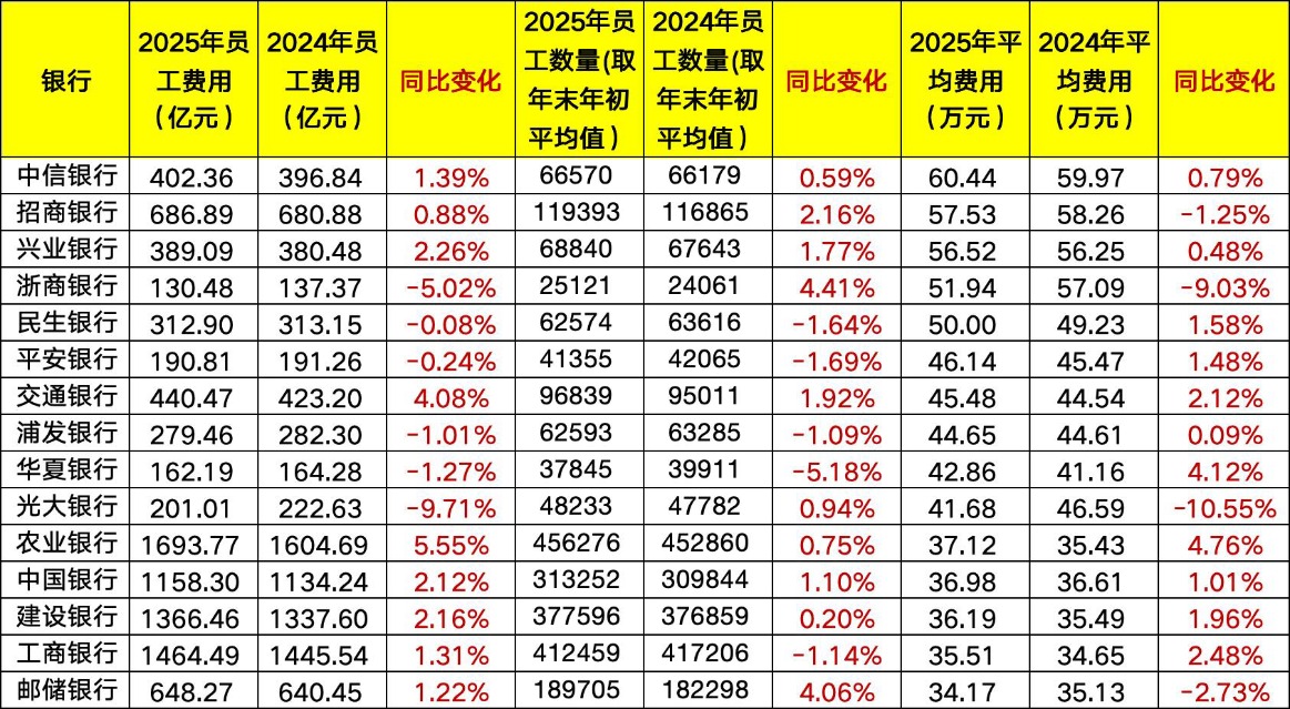 2025年,各家银行的员工费用达到什么水平?