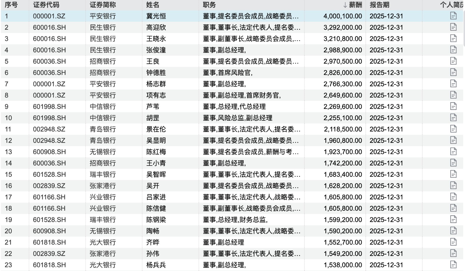 高管薪酬方面,股份行同样站在行业前列。