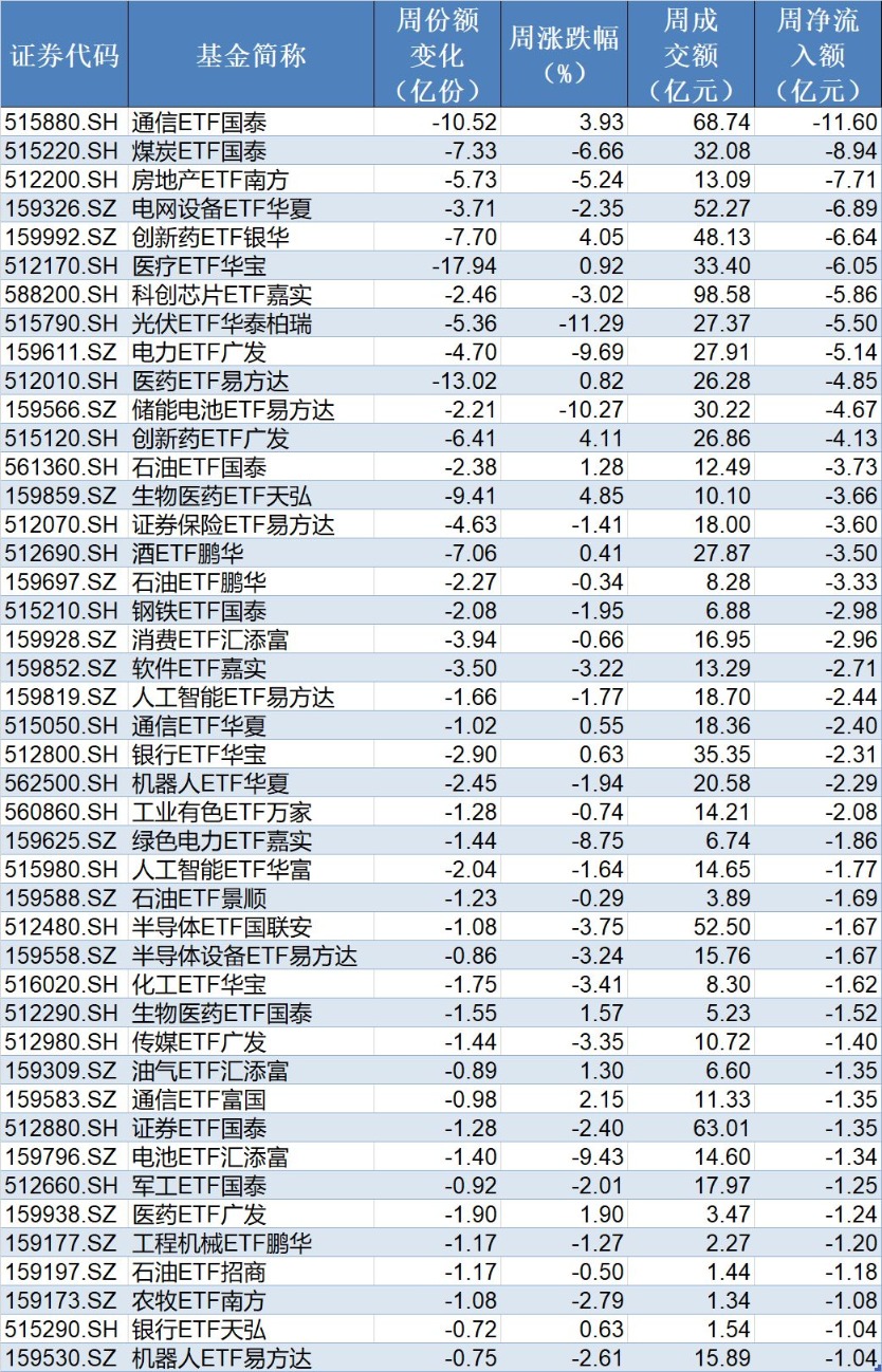 在资金流出方面,本周有44只行业主题ETF净流出逾1亿元,其中通信ETF国泰、煤炭ETF国泰、房地产ETF南方份额分别减少10.52亿份、7.33亿份和5.73亿份,分别净流出资金11.6亿元、8.94亿元和7.71亿元。