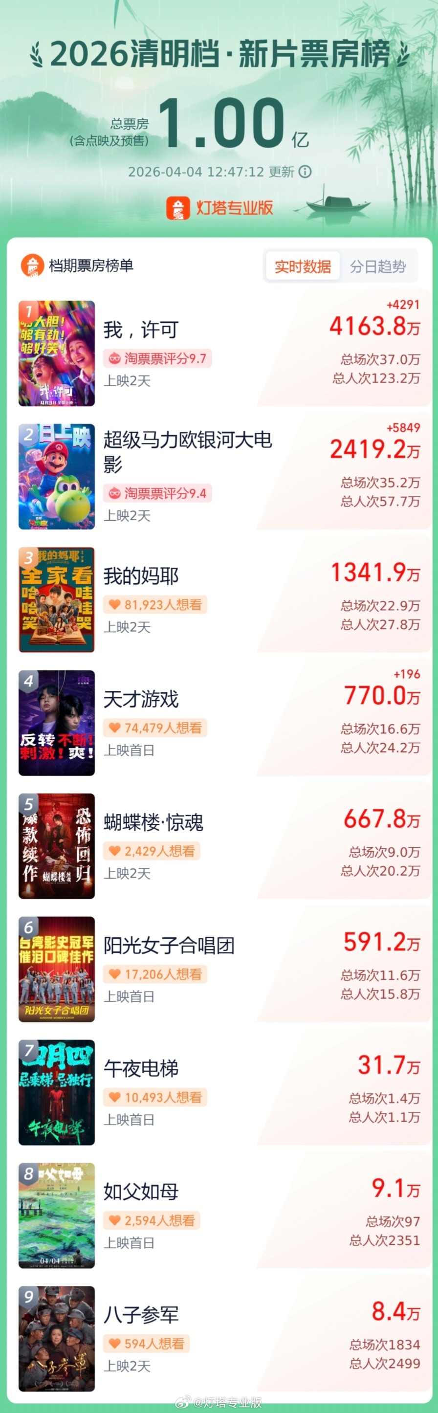据灯塔专业版,截至4月4日12时,2026年清明档新片总票房(含点映及预售)突破1亿,影片《我,许可》《超级马力欧银河大电影》《我的妈耶》《天才游戏》《蝴蝶楼·惊魂》暂列前五。