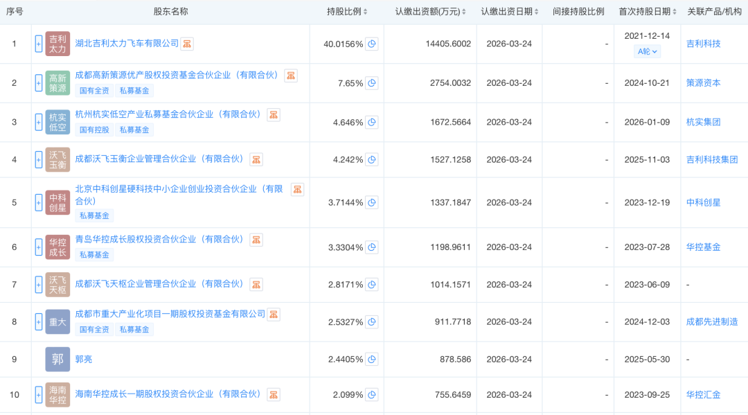 股权结构方面,吉利科技集团旗下湖北吉利太力飞车有限公司、策源资本、杭实集团、吉利科技集团旗下成都沃飞玉衡企业管理合伙企业(有限合伙)、中科创星为该公司前五大股东,分别持股40.0156%、7.65%、4.646%、4.242%、3.7144%。