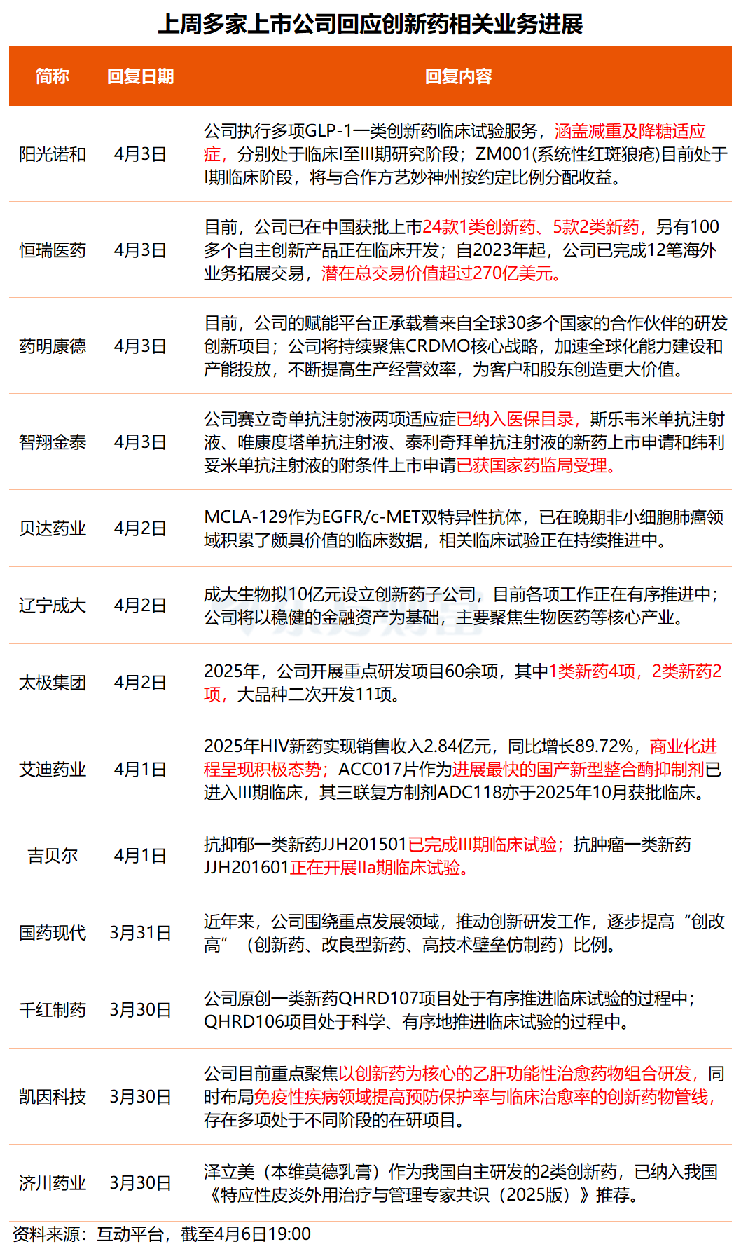 据不完全统计,上周有多家上市公司在互动平台对创新药相关提问进行了回复: