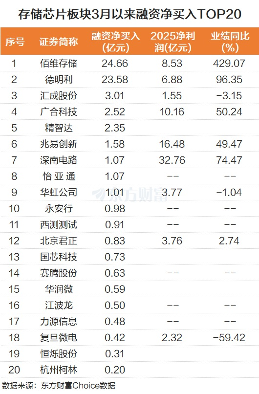 个股而言,存储芯片板块中佰维存储3月以来被融资净买入最多,为24.66亿元。德明利紧随其后,3月以来被融资净买入23.58亿元。整体而言,存储芯片板块有9股3月以来被融资净买入过亿,包括兆易创新、深南电路、华虹公司等行业龙头。