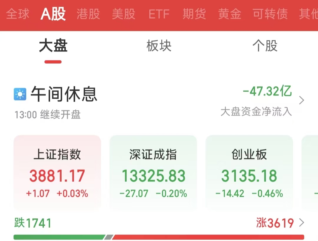 周二(4月7日),三大股指走势分化,整体维持震荡整理态势。截至上午收盘,上证指数微涨0.03%,报3881.17点;深证成指下跌0.2%,报13325.83点;创业板指下跌0.46%,报3135.18点。沪深两市合计成交额10720.91亿元,市场交投保持活跃。总体来看,两市个股涨多跌少,3619只个股实现上涨。