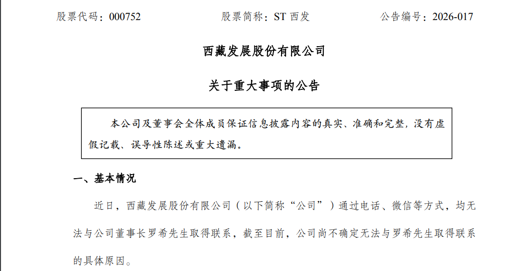 4月2日深夜,ST西发公告称,公司通过电话、微信等方式,均无法与罗希取得联系,尚不确定无法与罗希取得联系的具体原因。