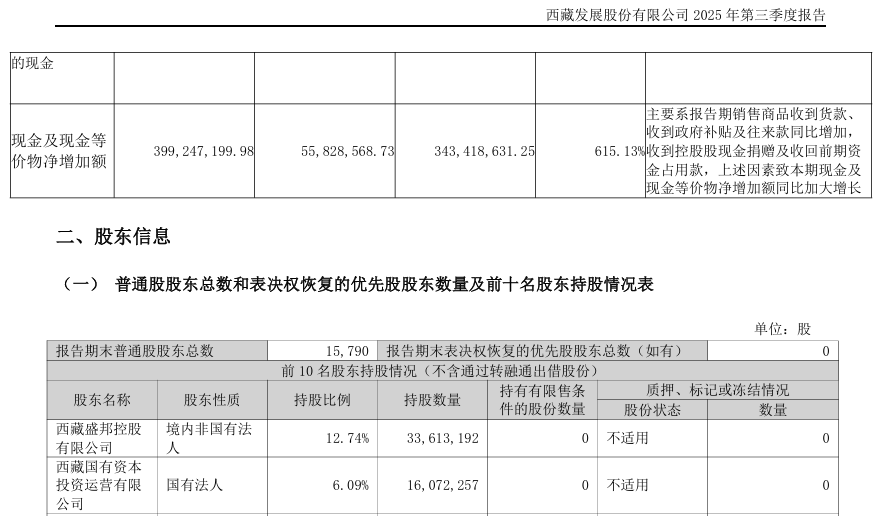 截至2025年第三季度末,ST西发第一大股东为罗希控制的西藏盛邦控股有限公司、第二大股东为西藏国有资本投资运营有限公司,持股比例分别为12.74%、6.09%。
