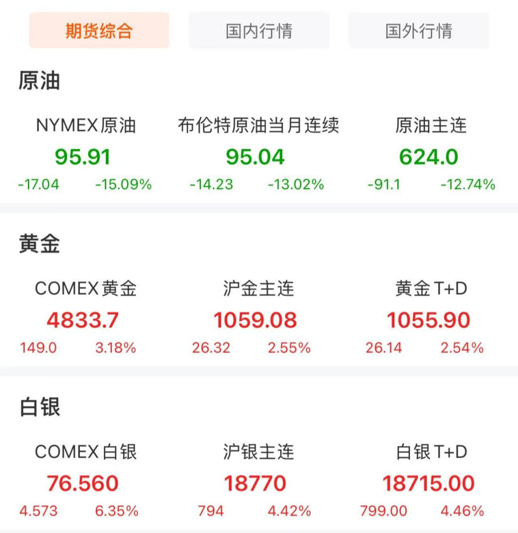 消息发布后,4月8日早盘,WTI原油低开低走一度跌近20%,截至发稿,报95.91美元/桶,跌幅15.09%。贵金属大幅反弹,截至发稿,COMEX黄金报4833.7美元/盎司,涨幅3.18%;COMEX白银报76.560美元/盎司,涨幅6.35%。