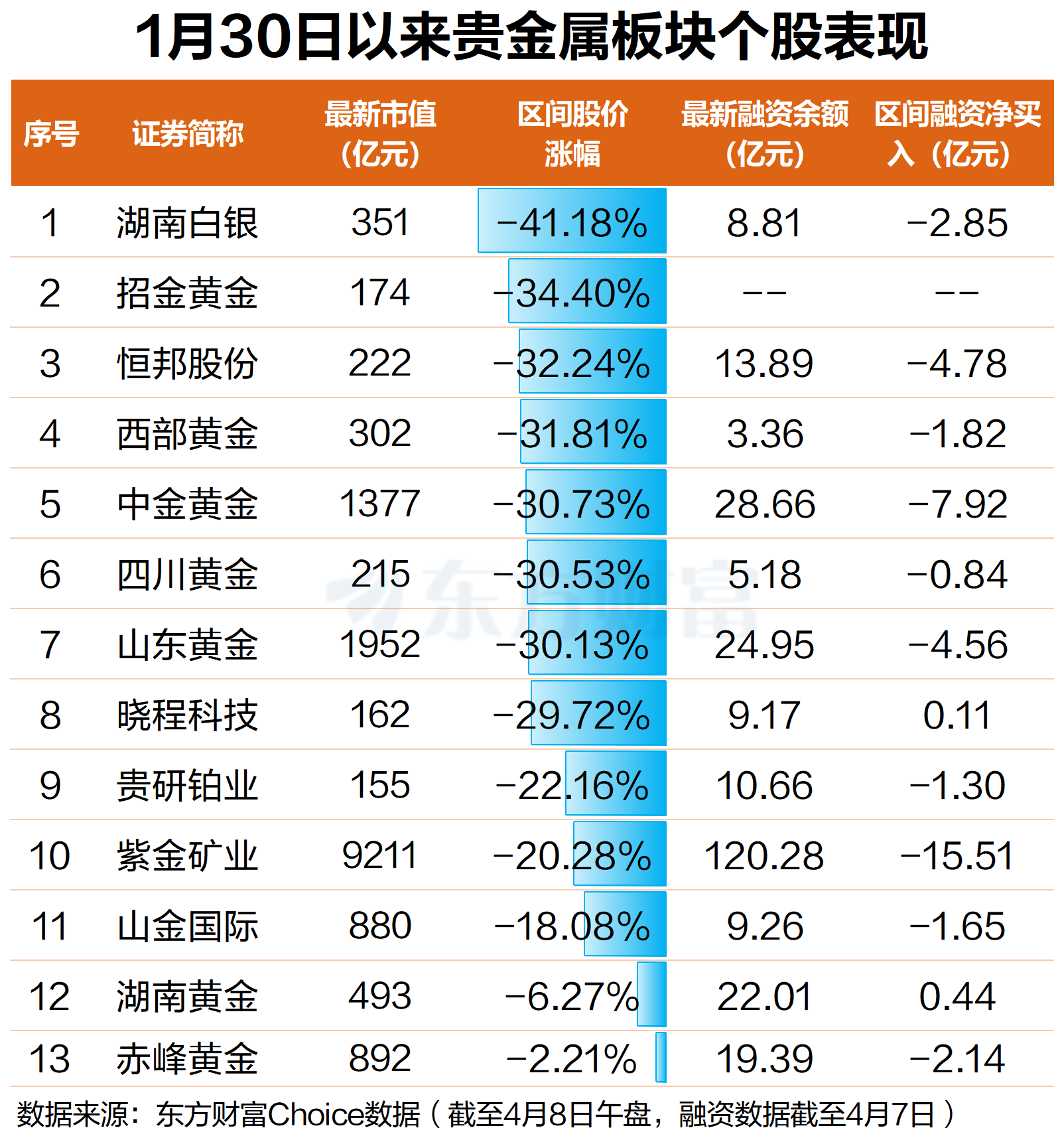 据东方财富Choice数据,1月30日至4月8日午盘,A股贵金属板块累计下跌27.64%。成份股集体调整,其中湖南白银跌幅最大,累计下跌41.18%;招金黄金、恒邦股份、西部黄金、中金黄金、山东黄金等跌幅居前,均跌超30%。