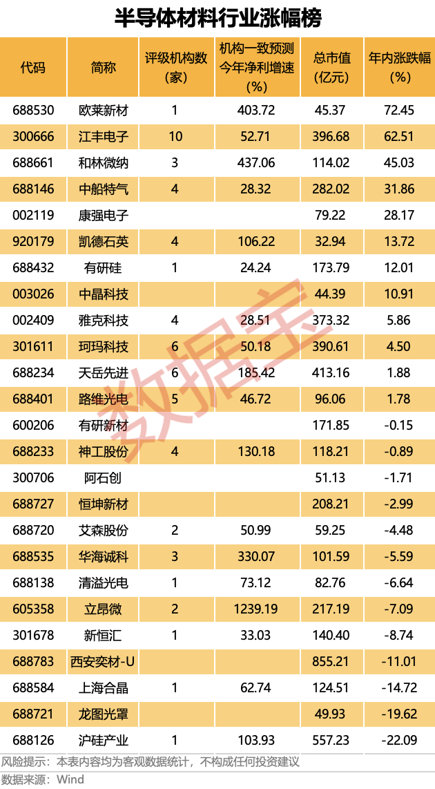 半导体材料行业的景气度也值得期待。据证券时报·数据宝统计,A股市场上半导体材料行业共有25股。其中,机构一致预测立昂微2026年净利增速超12倍居首。另外,和林微纳、欧莱新材、华海诚科等个股2026年净利增速预期均超100%。今年以来,近半数个股股价上涨,欧莱新材、江丰电子均累计大涨超60%。