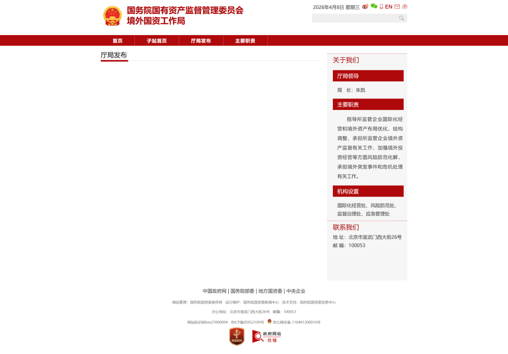 澎湃新闻记者注意到,国务院国资委官网已经上线境外国资工作局页面,局长为朱凯。机构设置包括:国际化经营处、风险防范处、监督治理处、应急管理处。