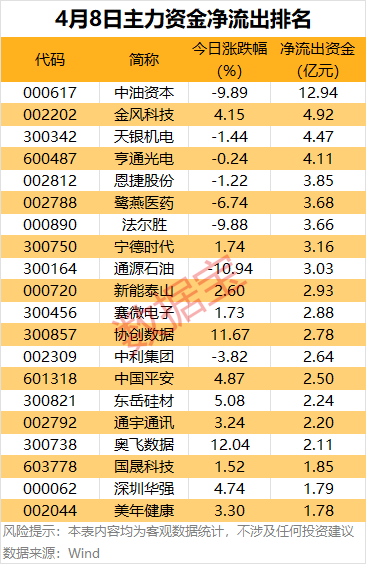 尾盘主力资金净流出方面,中油资本、宁德时代尾盘主力资金净流出均超1亿元,法尔胜、中利集团、宝丰能源、美年健康等尾盘主力资金净流出金额均超5000万元。