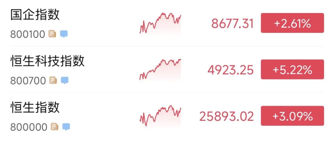 截至收盘,恒生指数涨3.09%,报25893.02点;恒生科技指数大涨5.22%,报4923.25点;恒生中国企业指数大涨2.61%,报8677.31点。