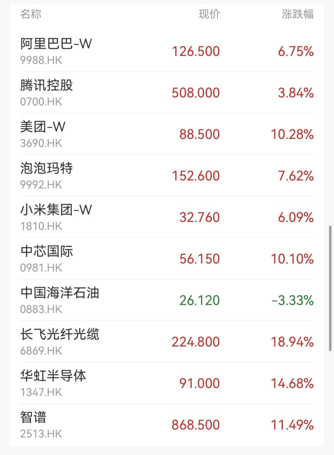 盘面上,科技权重股大反弹,美团大涨超10%,阿里巴巴、小米集团涨超6%,快手涨超4%,腾讯控股、京东集团涨超3%;半导体股上扬,华虹半导体涨超14%,上海复旦涨超11%,中芯国际涨超10%;黄金股活跃,中国黄金国际、潼关黄金涨超10%;航空股集体上涨,中国东方航空股份涨超8%。