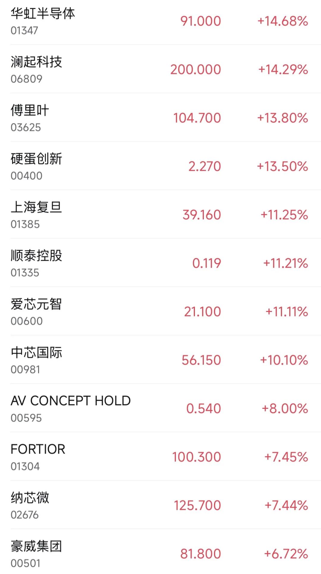 4月8日,港股芯片股集体走强,天数智芯涨超33%,华虹半导体、澜起科技涨超14%,傅里叶涨超13%,上海复旦涨超11%,中芯国际涨超10%,爱芯元智、壁仞科技等均上涨。