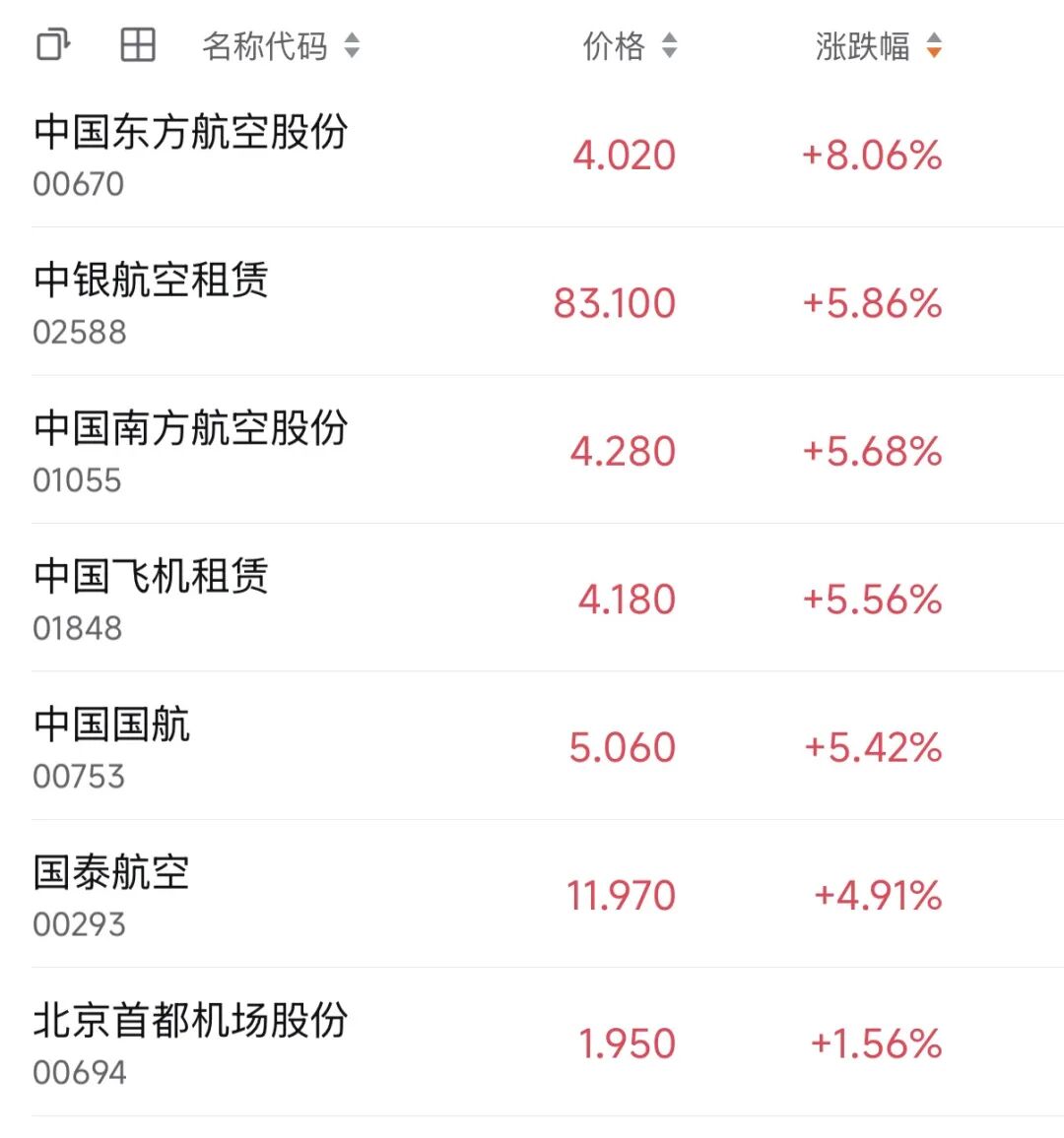 4月8日,港股航空股集体上涨,中国东方航空股份涨超8%,中银航空租赁、中国南方航空股份、中国飞机租赁、中国国航、国泰航空等跟涨。