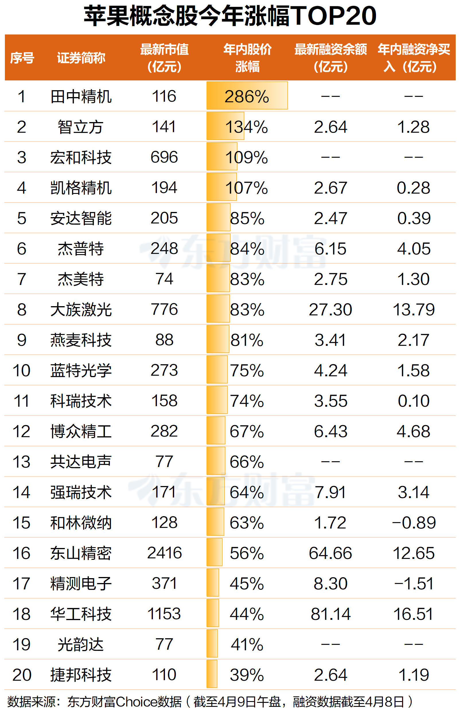 A股方面,据东方财富Choice数据,截至4月9日午盘,苹果概念板块年内累计上涨14.37%,而同期沪深300指数下跌1.38%,苹果概念大幅跑赢市场基准。成份股中,田中精机涨幅最大,年内暴增286%;智立方、宏和科技、凯格精机涨幅居前,均超100%;安达智能、杰普特、杰美特等多股均涨超80%。