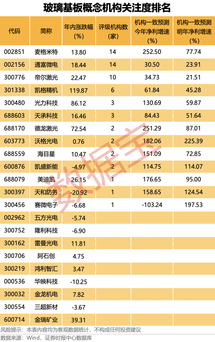 据证券时报·数据宝统计,A股市场上合计有22只玻璃基板概念股。其中,沃格光电、天和防务、凯盛新能等个股机构一致预测今明两年净利增速均超100%,成长性惊人。