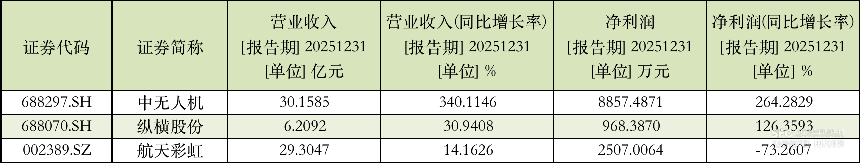 近日,中无人机(688297.SH)、纵横股份(688070.SH)与航天彩虹(002389.SZ)三家无人机整机企业陆续交出了2025年成绩单。