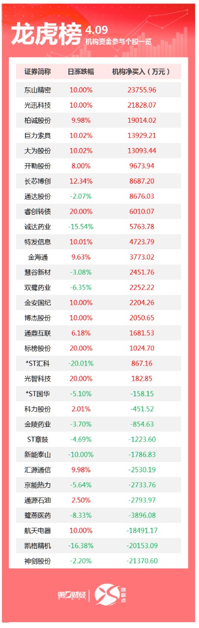 盘后数据显示,4月9日龙虎榜中,共32只个股出现了机构的身影,有20只股票呈现机构净买入,12只股票呈现机构净卖出。