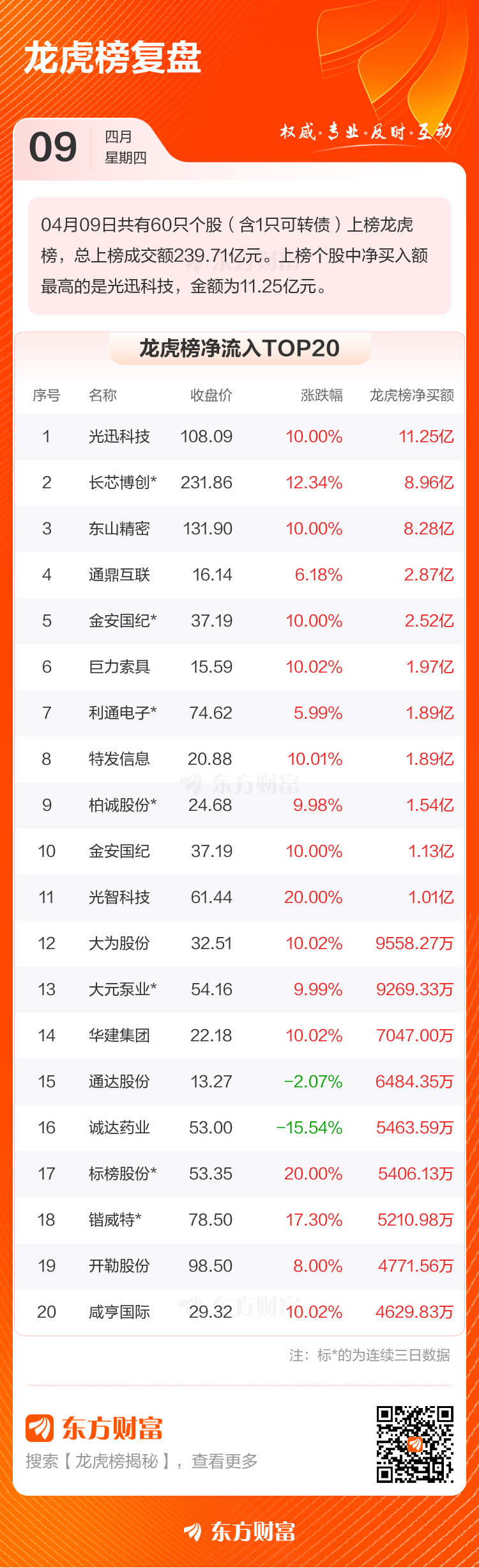 4月9日共有60只个股(含1只可转债)上榜龙虎榜,总上榜成交额239.71亿元。上榜个股中净买入额最高的是光迅科技,金额为11.25亿元。