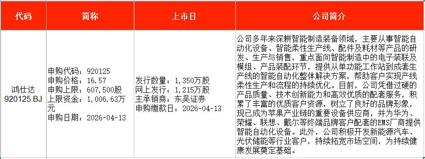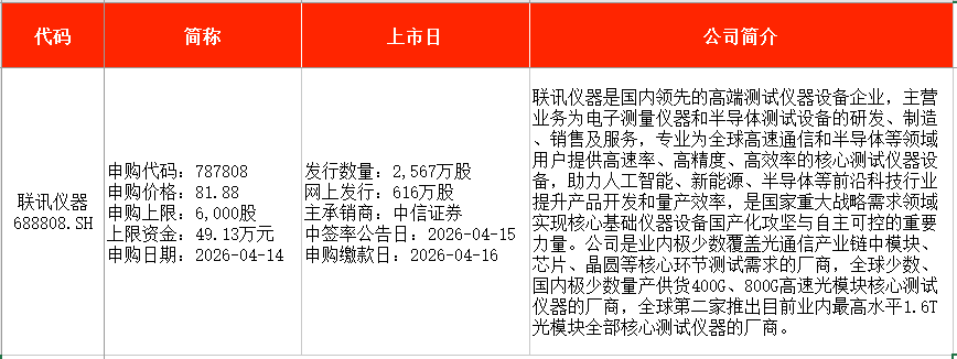 从时间表看,鸿仕达(920125)在本周一(4月13日)申购,联讯仪器(688808)将在本周二(4月14日)申购。