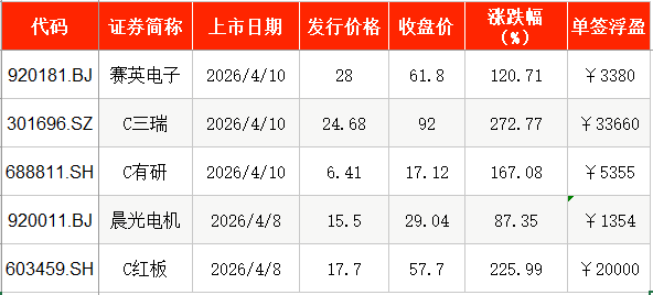 4月10日,赛英电子(920181)在北交所挂牌上市,发行价为28元/股,截至上市首日收盘,该股报61.8元/股,涨幅为120.71%。以收盘价计算,投资者中一签浮盈为3380元。