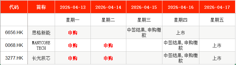 其中,思格新能(06656.HK)在本周一申购;MANYCORE TECH(00068.HK)、长光辰芯(03277.HK)均在本周一至本周二申购。