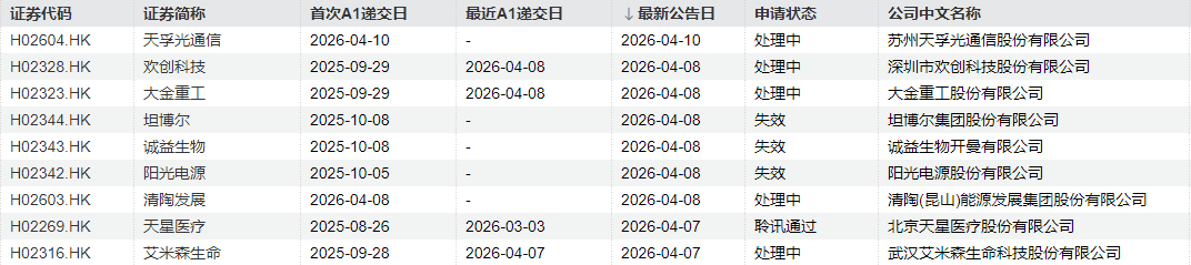 北京天星医疗股份有限公司的聆讯通过。坦博尔集团股份有限公司、诚益生物开曼有限公司、阳光电源股份有限公司等公司的港股申请失效。
