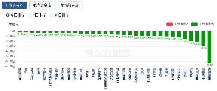净流出方面,通信设备、消费电子、电网设备等净流出排名靠前,其中通信设备净流出63.32亿元。