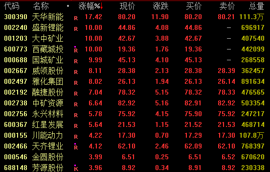 锂矿概念盘中强势拉升,截至收盘,天华新能涨超17%,盘中一度逼近涨停;盛新锂能、大中矿业、西藏城投、国城矿业等涨停,融捷股份、中矿资源涨约7%。