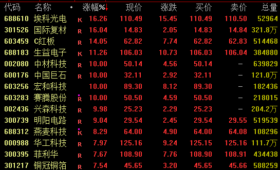PCB概念盘中强势上扬,截至收盘,埃科光电涨超16%续创新高,生益电子涨超11%,中国巨石、宏和科技涨停均创新高,华工科技涨约8%。