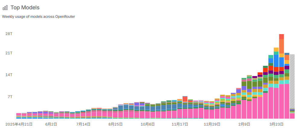 根据OpenRouter的数据,2026年元旦之后,全球头部模型的Token调用量大幅上升。最近4周,Token的周度调用量均超过20万亿,3月30日至4月5日当周更是达到27万亿Token。