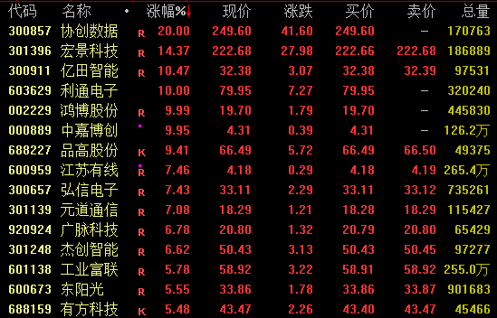算力概念盘中强势拉升,截至收盘,协创数据20%涨停,宏景科技涨超14%,盘中涨停续创新高;利通电子、鸿博股份、中嘉博创等涨停,工业富联涨近6%。
