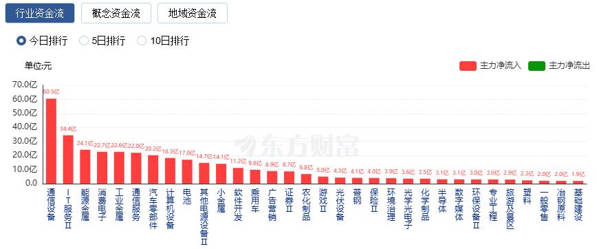 行业资金方面,截至收盘,通信设备、IT服务、能源金属等净流入排名靠前,其中通信设备净流入60.51亿。