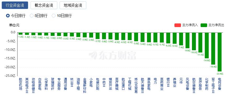 净流出方面,电网设备、军工电子、化学制药等净流出排名靠前,其中电网设备净流出22.38亿元。