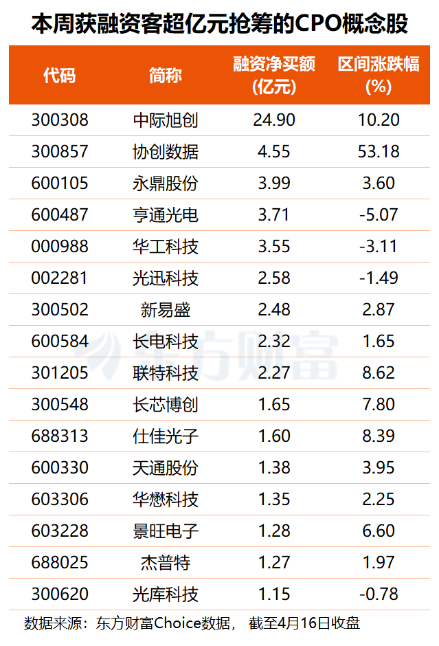 从资金角度看,东方财富Choice数据显示,本周多达16只CPO概念股获得超1亿元杠杆资金加仓,其中,中际旭创获融资客疯狂扫货24.90亿元,协创数据、永鼎股份、亨通光电、华工科技融资净买额均在3.5亿元至4.6亿元之间。