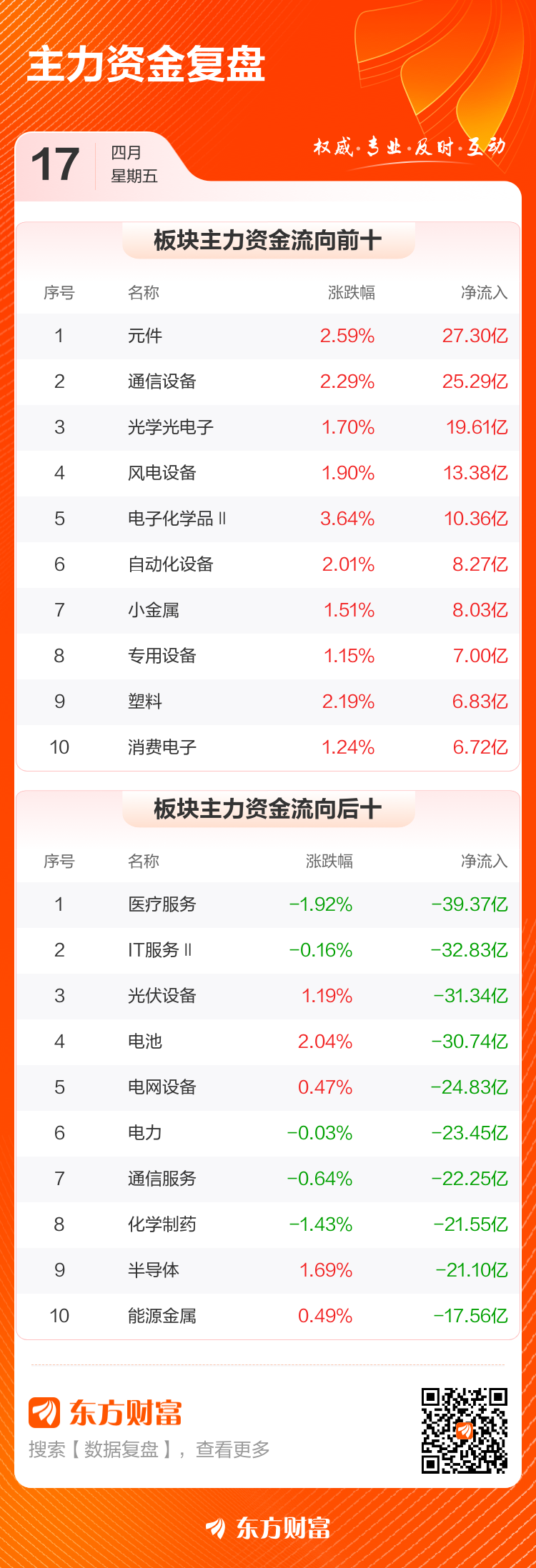 4月17日,沪指跌0.1%,深成指涨0.6%,创业板指涨1.43%。两市成交额2.43万亿,较上个交易日放量839亿。数据显示,今日大盘主力资金净流出452.64亿。元件、通信设备、光学光电子等板块主力资金流入排名居前,其中元件净流入27.30亿元。