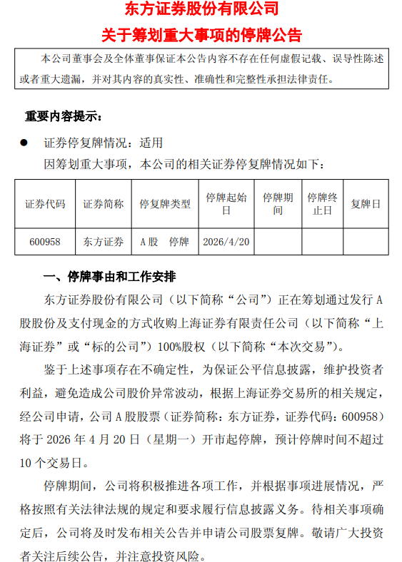 东方证券4月19日公告,公司正在筹划通过发行A股股份及支付现金的方式收购上海证券有限责任公司100%股权。鉴于该事项存在不确定性,为维护投资者利益,避免股价异常波动,公司A股股票将于4月20日开市起停牌,预计停牌时间不超过10个交易日。