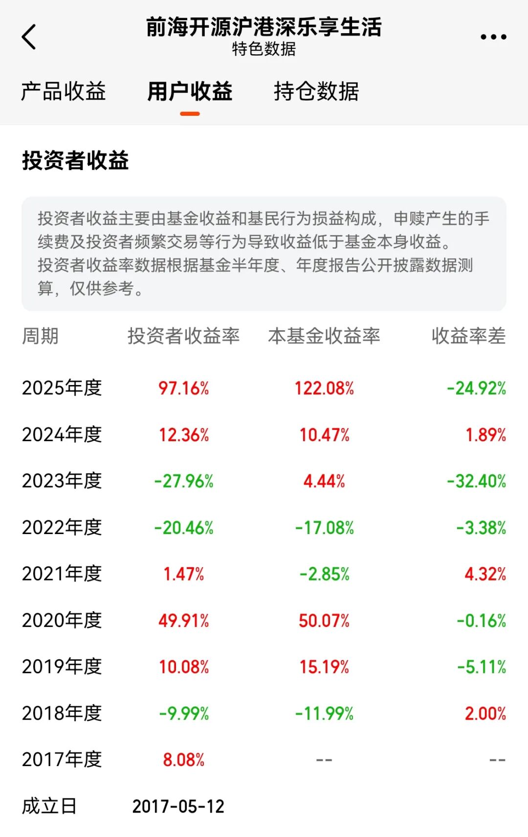 从天天基金网平台来看,持有前海开源沪港深乐享生活来对比投资者收益率和本基金收益率,2018年至2025年来看,收益率差为负数的有5个年度,分别为2019年、2020年、2022年、2023年、2025年,尤其2025年该基金收益率达到122.08%,但投资者实际收益率仅97.16%。在市场震荡下跌的2023年,基金实际收益率为正,达到4.44%,但投资者收益率亏损27.96%,显然投资者体感差巨大。