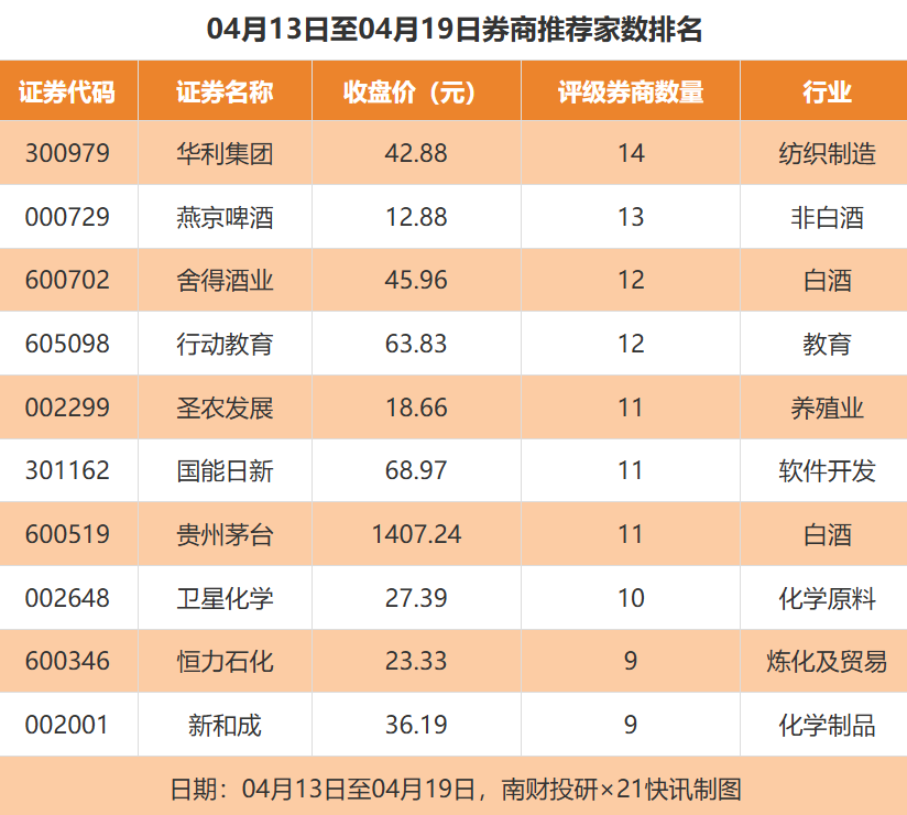 从券商推荐家数来看,4月13日至4月19日有487家上市公司得到券商推荐,其中华利集团获得14家推荐,燕京啤酒获得13家推荐,舍得酒业获得12家推荐。